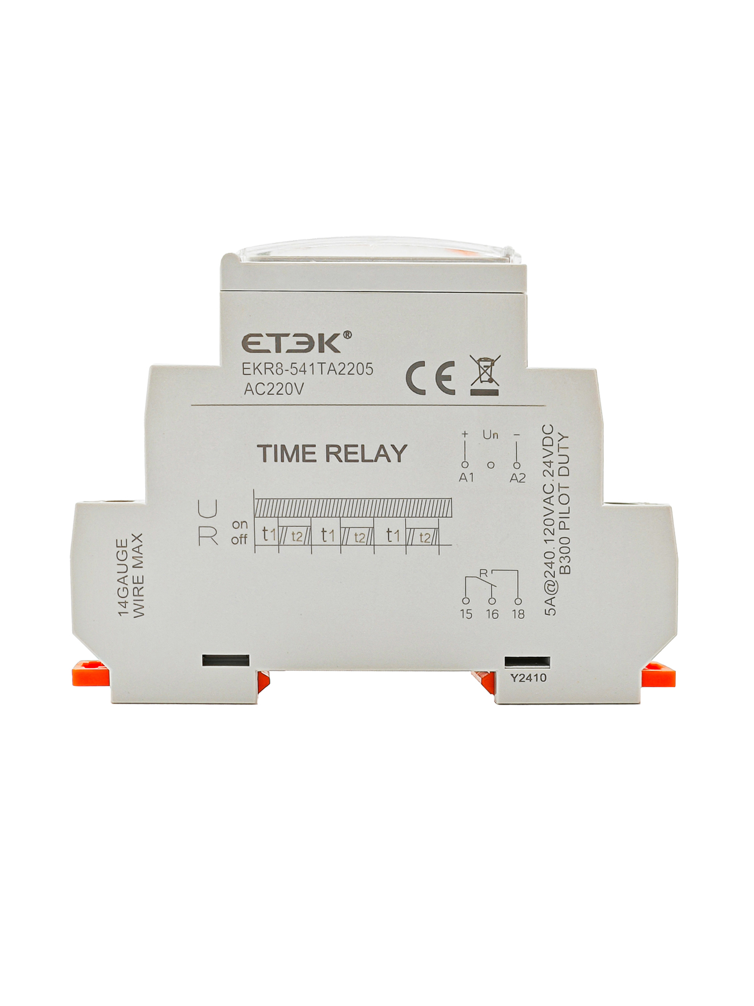 EKR8-541TA2205 — модульное многофункциональное реле времени серии EKR8-5 с режимом циклической работы (T1/T2). Позволяет задавать отдельные интервалы включения и паузы в широком диапазоне от 1 с до 10 суток, что удобно для «мигающих» режимов, периодического включения нагрузки и поэтапных технологических циклов. Исполнение TA2205 рассчитано на питание ~220 В AC и имеет 1 переключающий контакт (SPDT) на 5 A. На лицевой панели — отдельные ручки выбора диапазона и точной уставки по каждому интервалу, а также светодиодные индикаторы питания/работы.