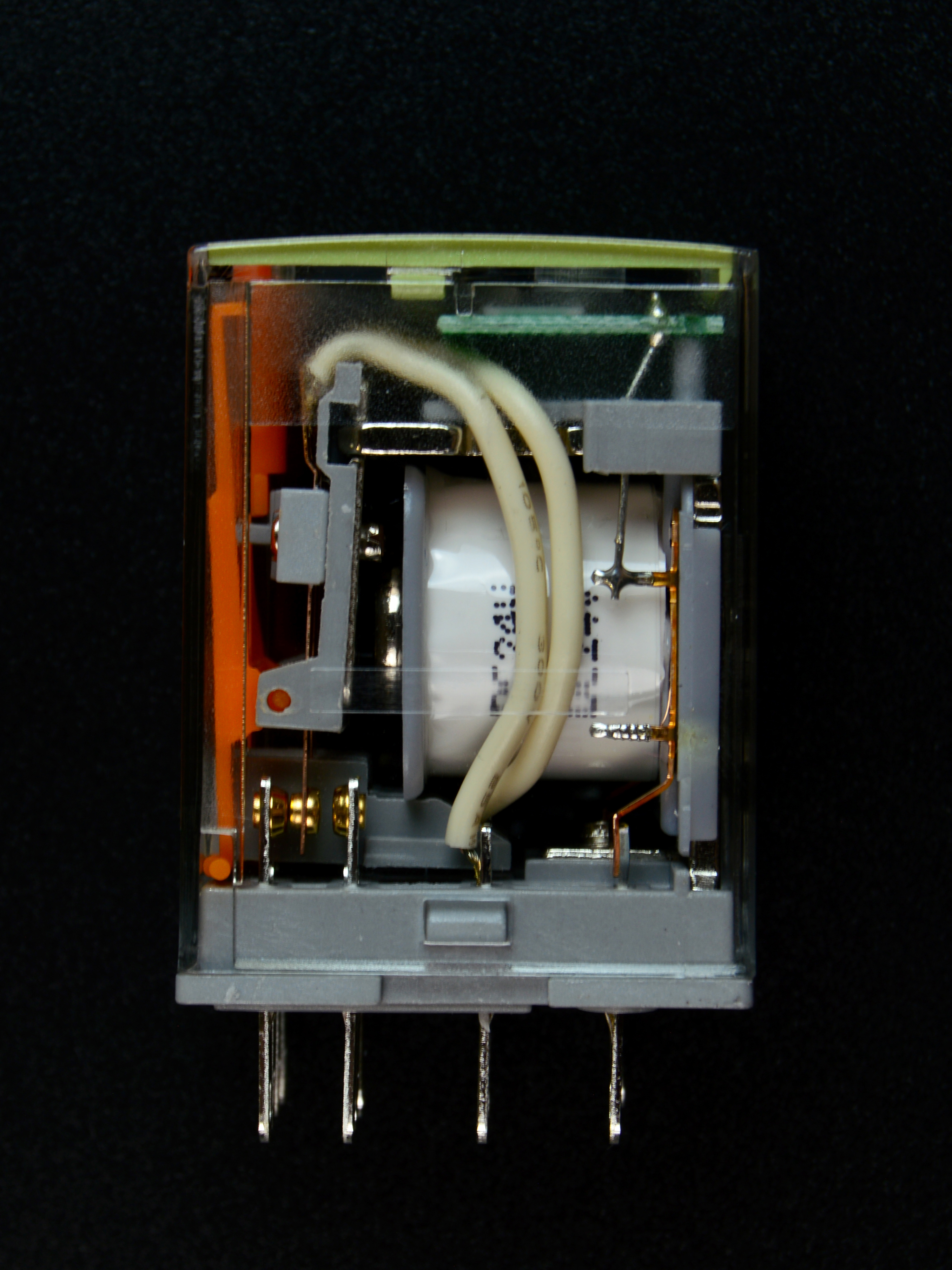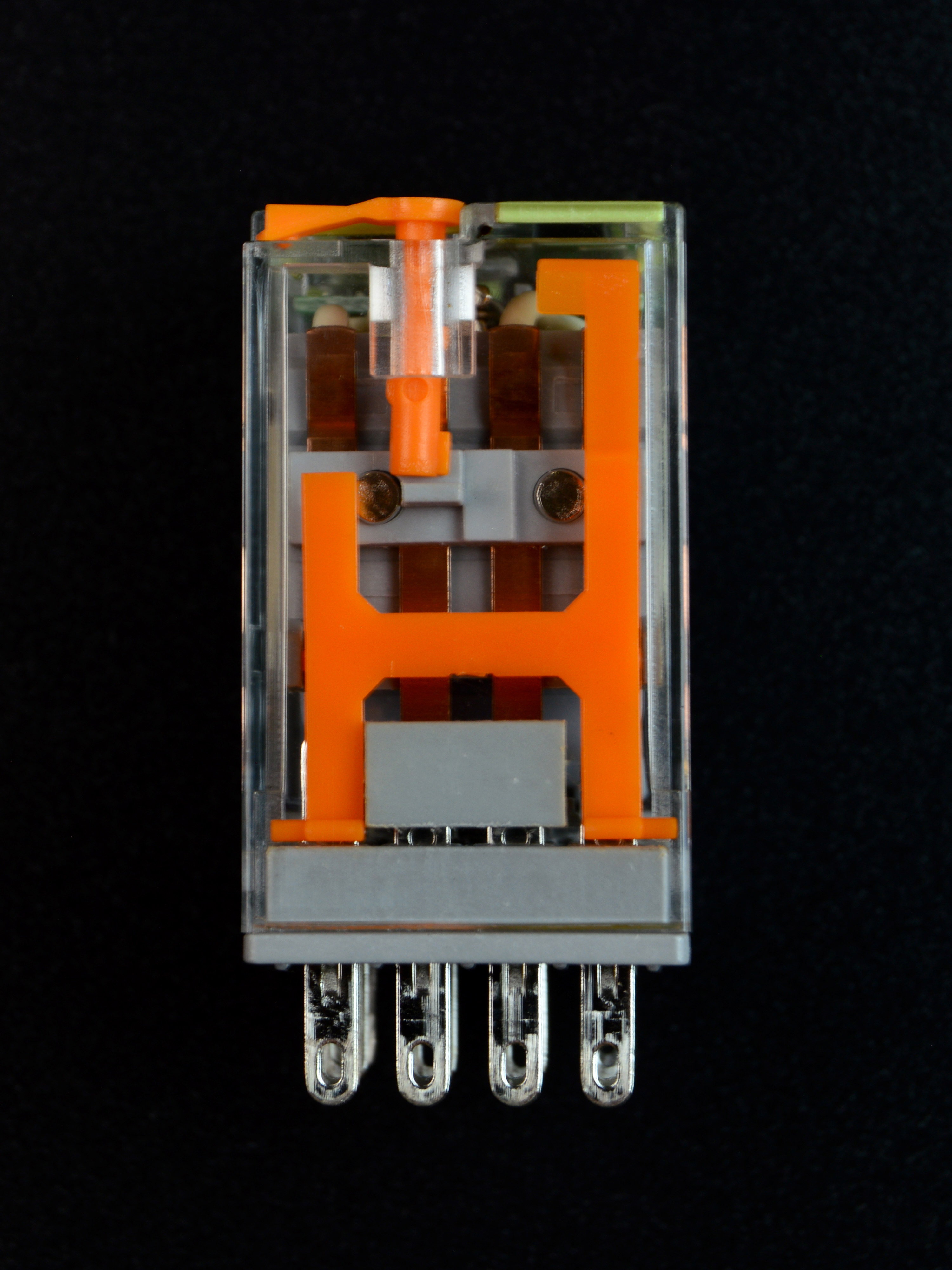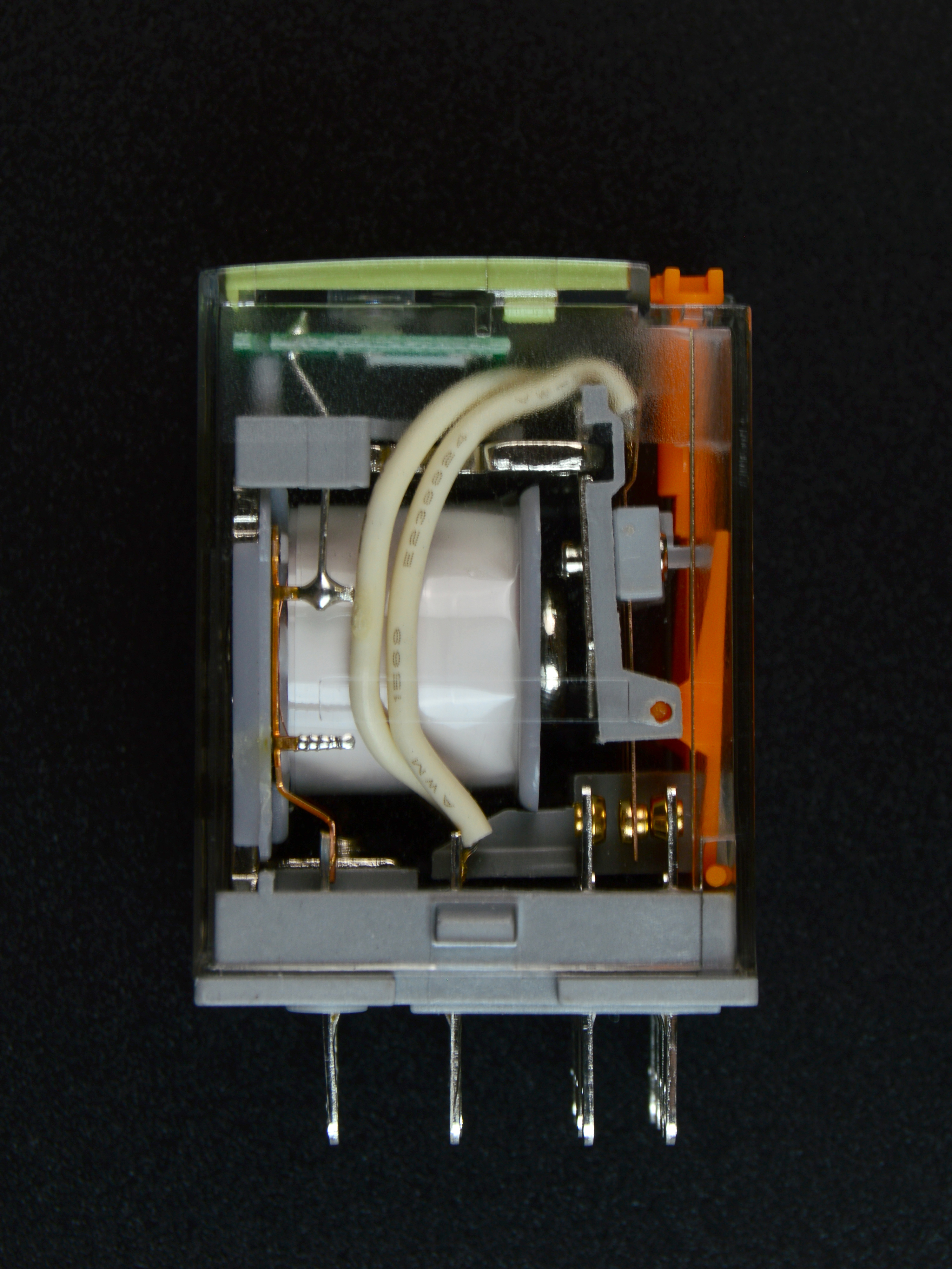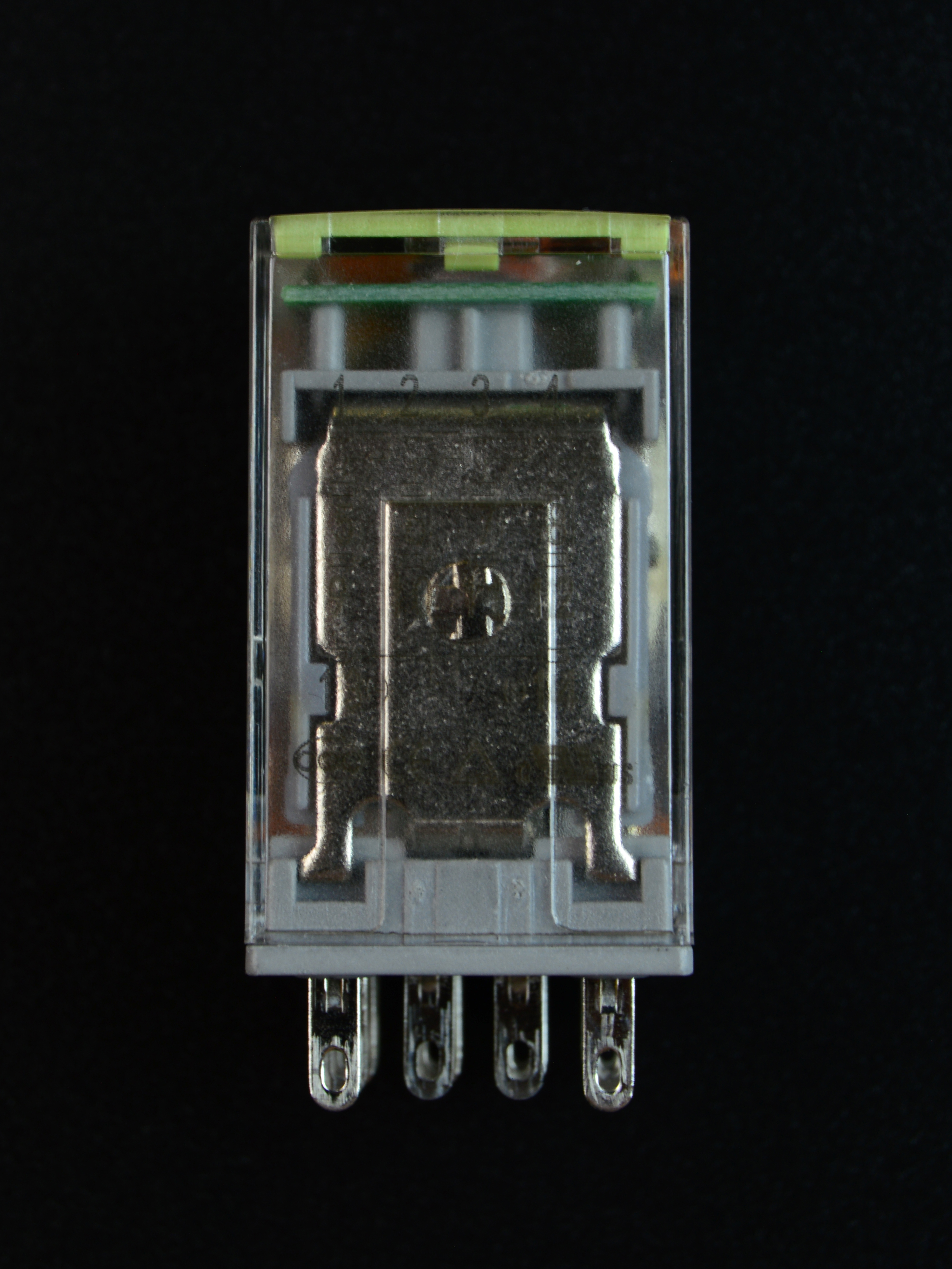 Четырёхконтактное реле с LED-индикацией состояния катушки и тестовой кнопкой/фиксацией для быстрой проверки схемы без внешнего сигнала. Устанавливается в стандартные 14-контактные основания тип PYF14A с монтажом на DIN-рейку 35 мм. Серебряное покрытие контактов снижает переходное сопротивление, уменьшает риск подгорания и повышает ресурс коммутаций.